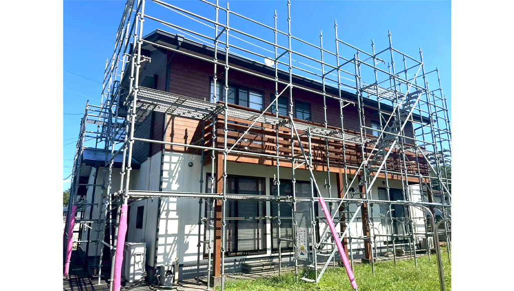 高圧洗浄、コーキング打ち、ベランダ木部、足場、飛散防止ネット
